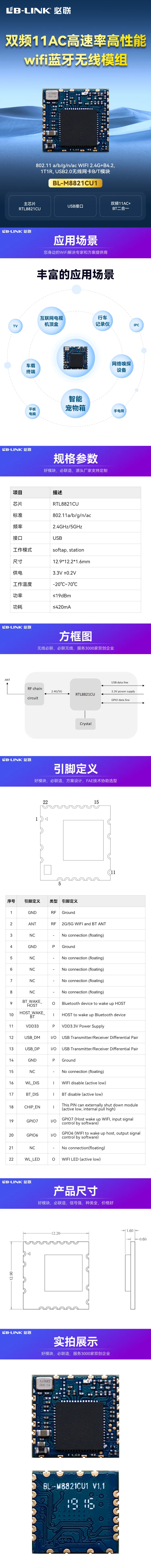 1T1R 802.11a/b/g/n/ac WiFi+BT4.2模组